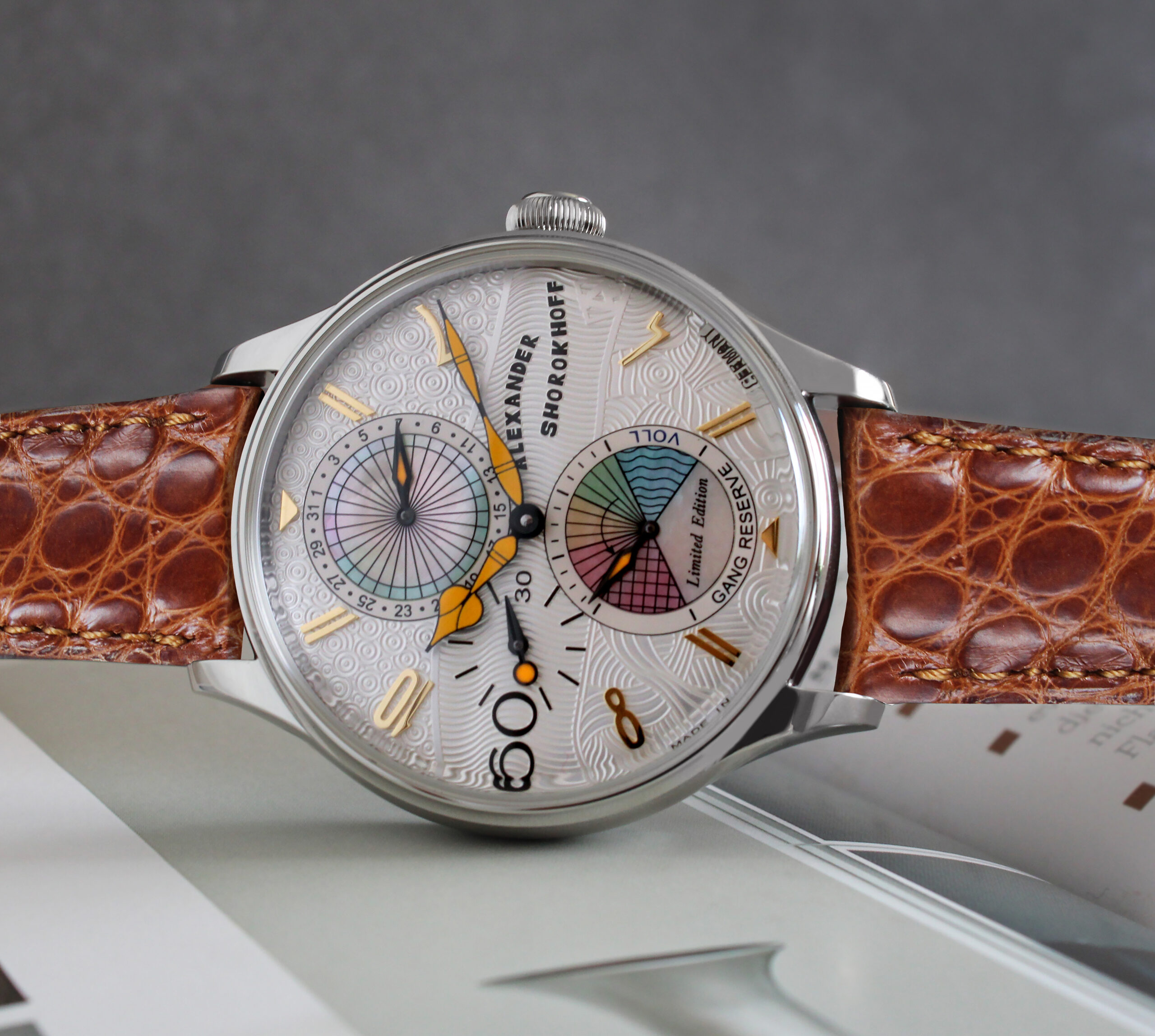 The two mother-of-pearl subdials give the watch its name. The upper subdial, designed in light mother-of-pearl, displays the date, while the lower subdial shows the power reserve in different mother-of-pearl colors. Despite their striking color, the dark yellow hands with a black decorative line blend harmoniously into the overall picture. The hour appliqués are also designed as high-quality, gold-plated elements and blend seamlessly into the overall picture.