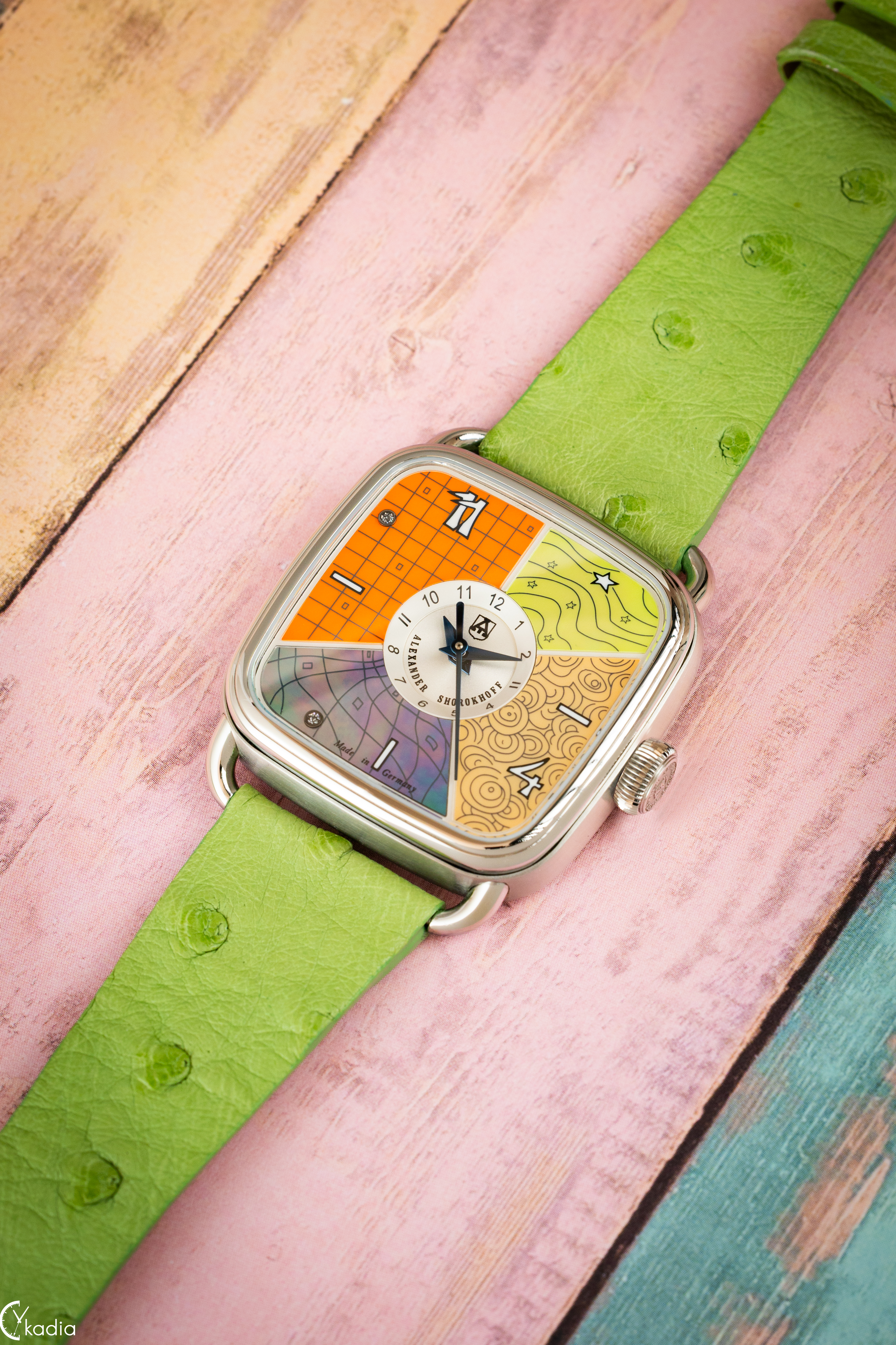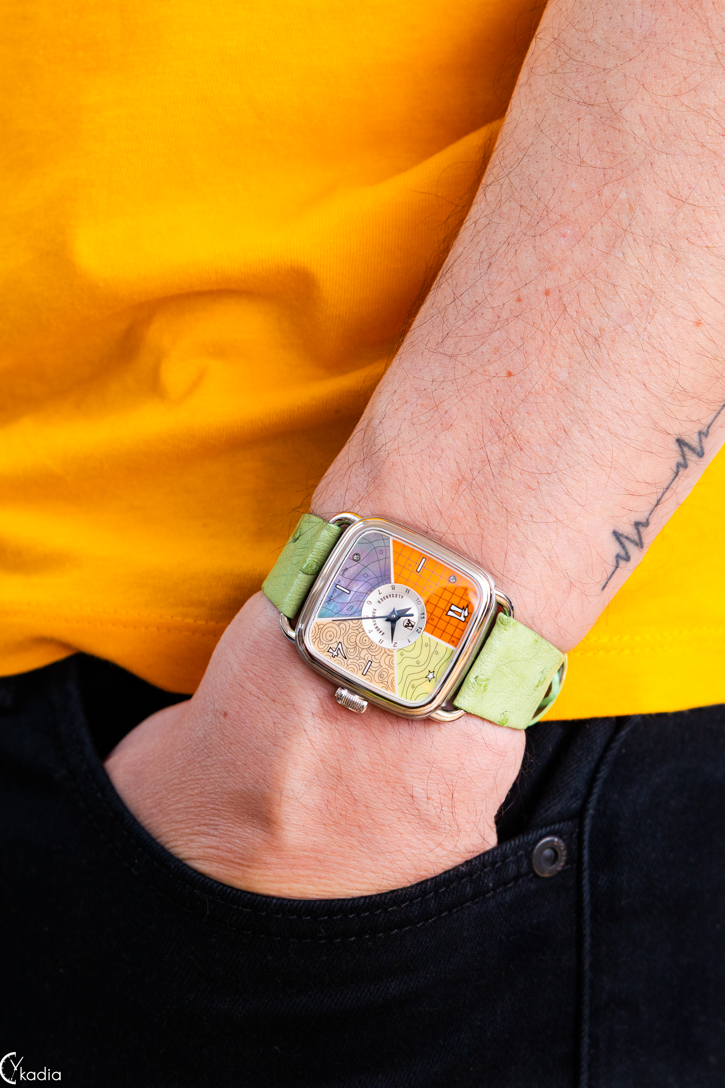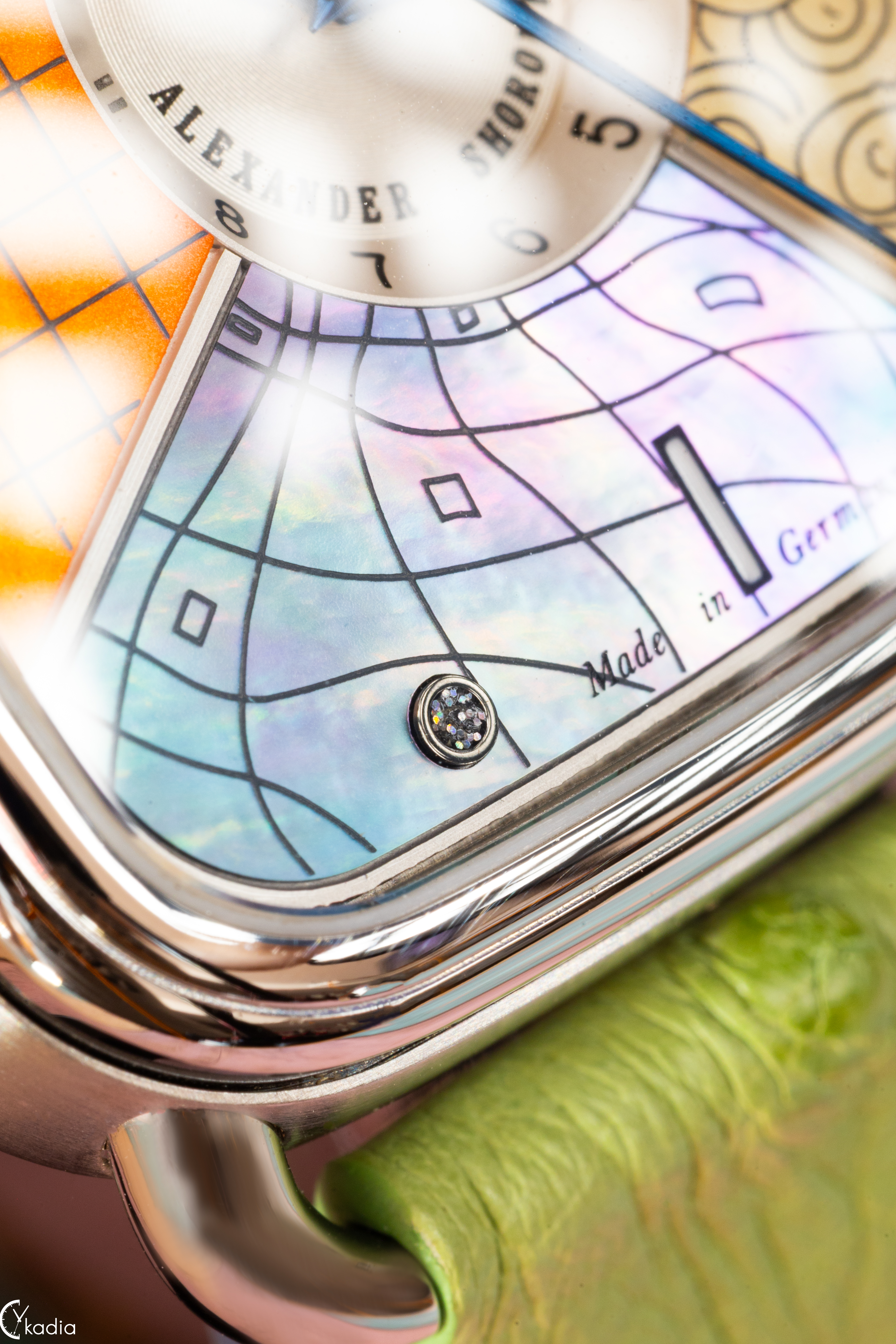 The watch has a size of 36 mm x 36 mm and features a mother-of-pearl dial in four colors. The dial design is avant-garde, with each color symbolizing a season and featuring a corresponding decorative design interpreted by designer Alexander Shorokhov. The green iridescent mother-of-pearl represents spring and the awakening of nature. The lighter mother-of-pearl area with circles symbolizes summer with avant-garde depictions of flowers. The dark blue mother-of-pearl represents winter, while the orange represents autumn, symbolizing the change in nature.