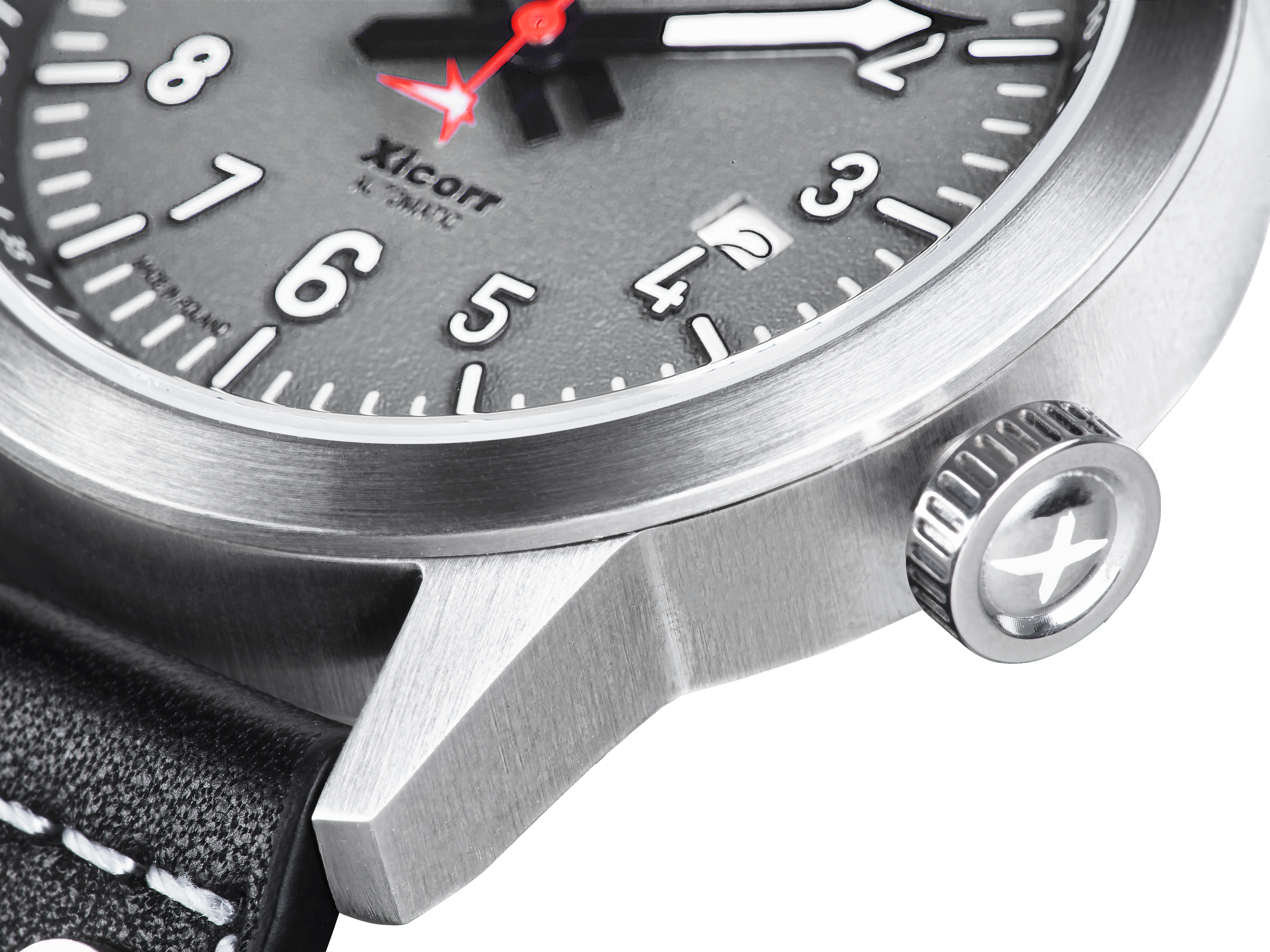 44 mm case. A large, comfortable crown with elements corresponding to the indexes on the dial. Xicorr logo made of luminous material - luma.