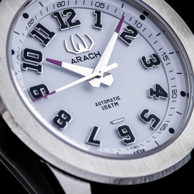 Zegarek Arach A93H jest w kolorze białym z różowymi akcentami na końcach wskazówek.
