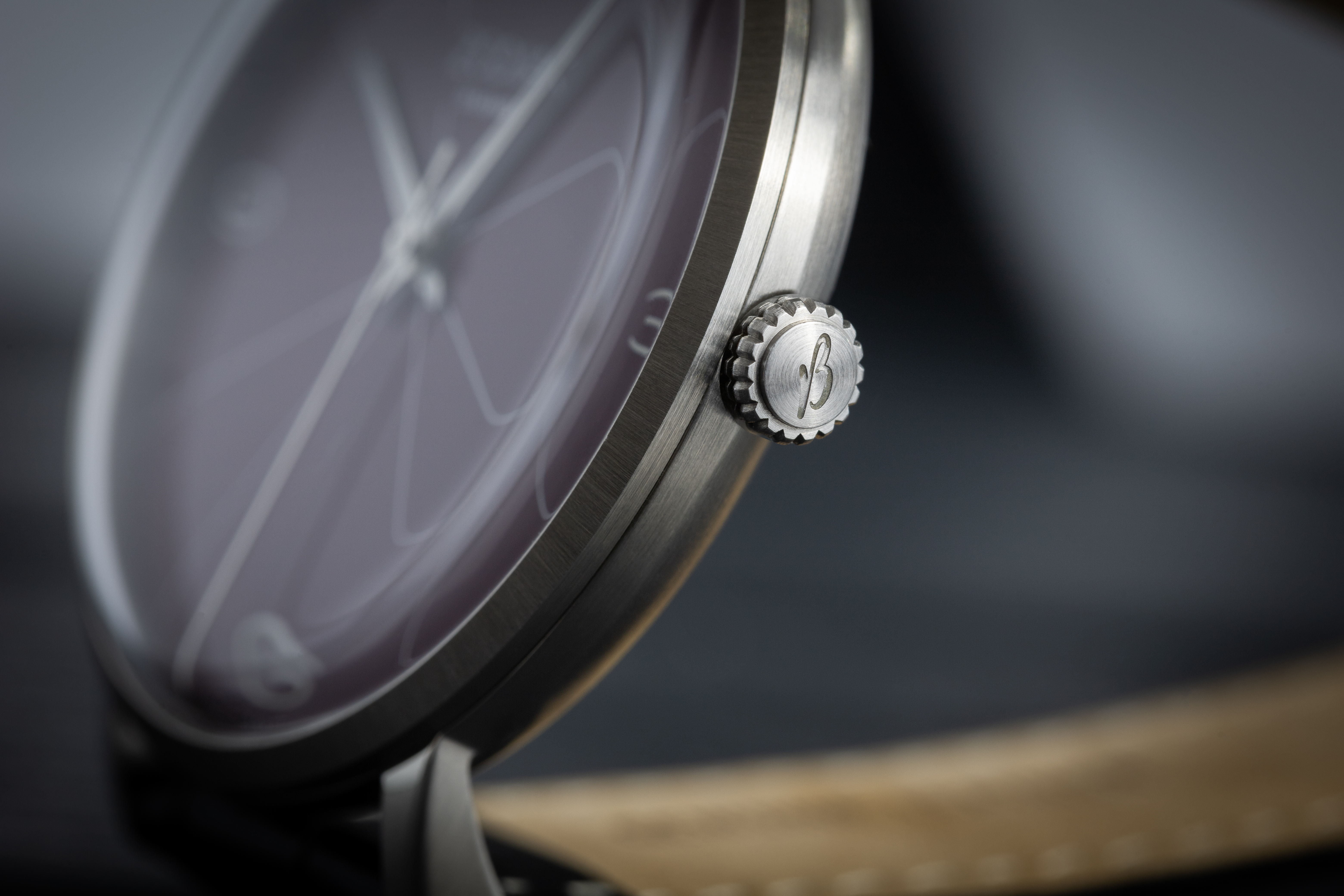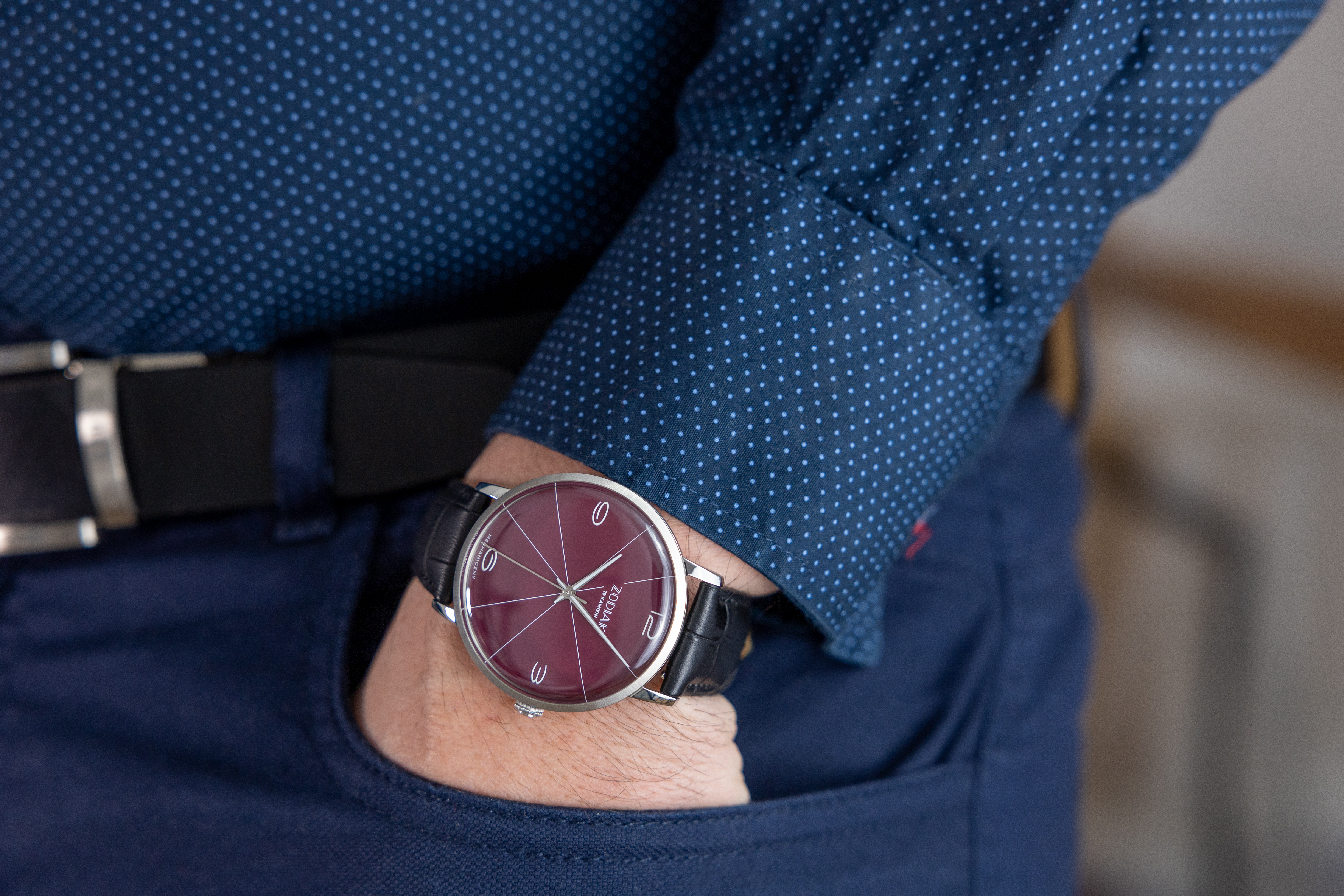 Zegarek przyciąga spojrzenia niecodzienną emaliowaną tarczą w kolorze bordowym, głębokim jak dojrzała śliwka. To barwa z charakterem, dla mężczyzny, który nie boi się wyróżnić. Czarna masa fluorescencyjna na cyfrowych indeksach i wskazówkach dodaje funkcjonalności, ale nie odbiera uroku.