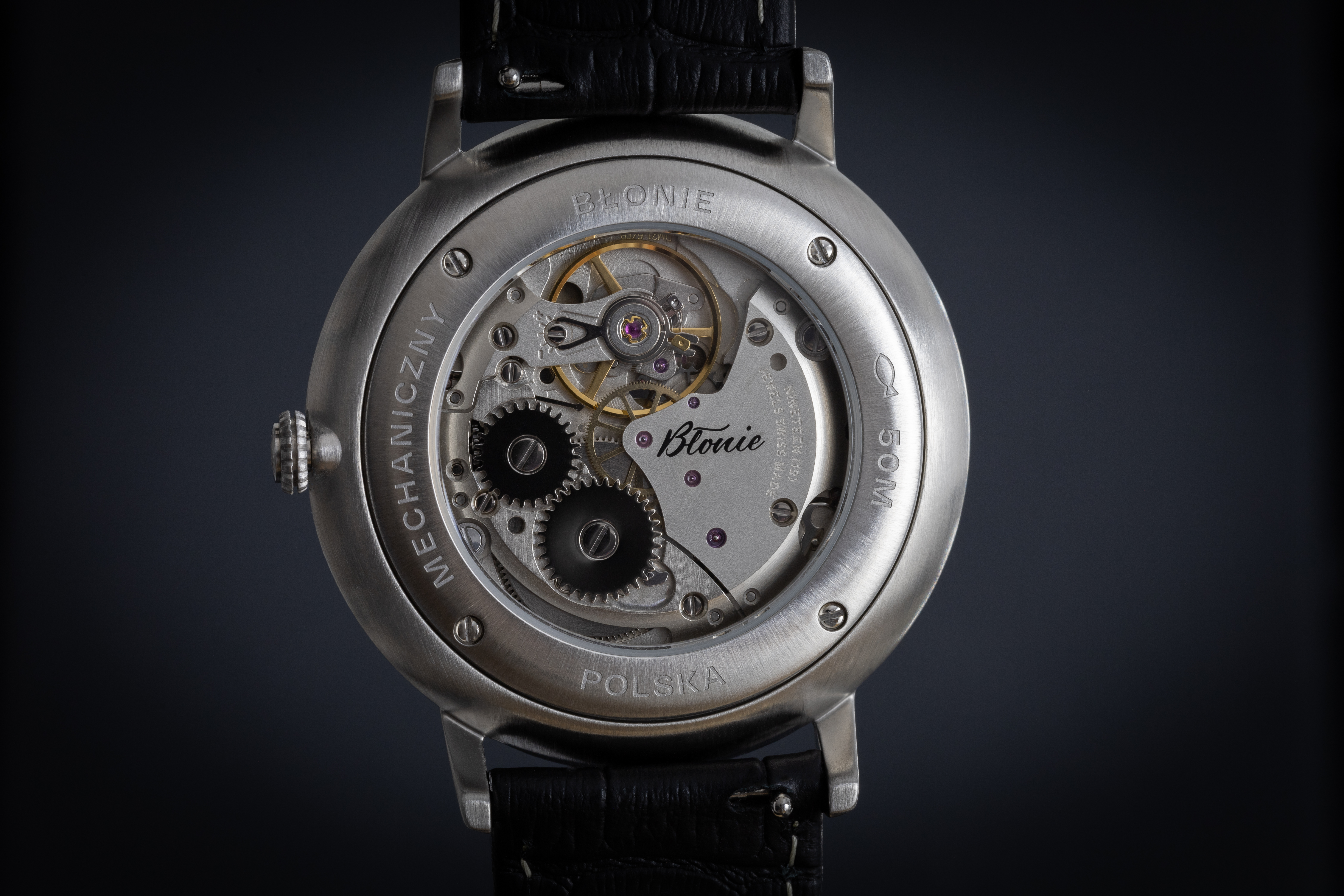 Pod tarczą pracuje szwajcarski kaliber Sellita SW210, mechanizm z ręcznym naciągiem, który wymaga codziennego kontaktu. To zegarek dla tych, którzy rozumieją rytuał, a nie tylko funkcję. Pracę werku można obserwować przez przeszklony dekiel, mocowany na cztery śruby.