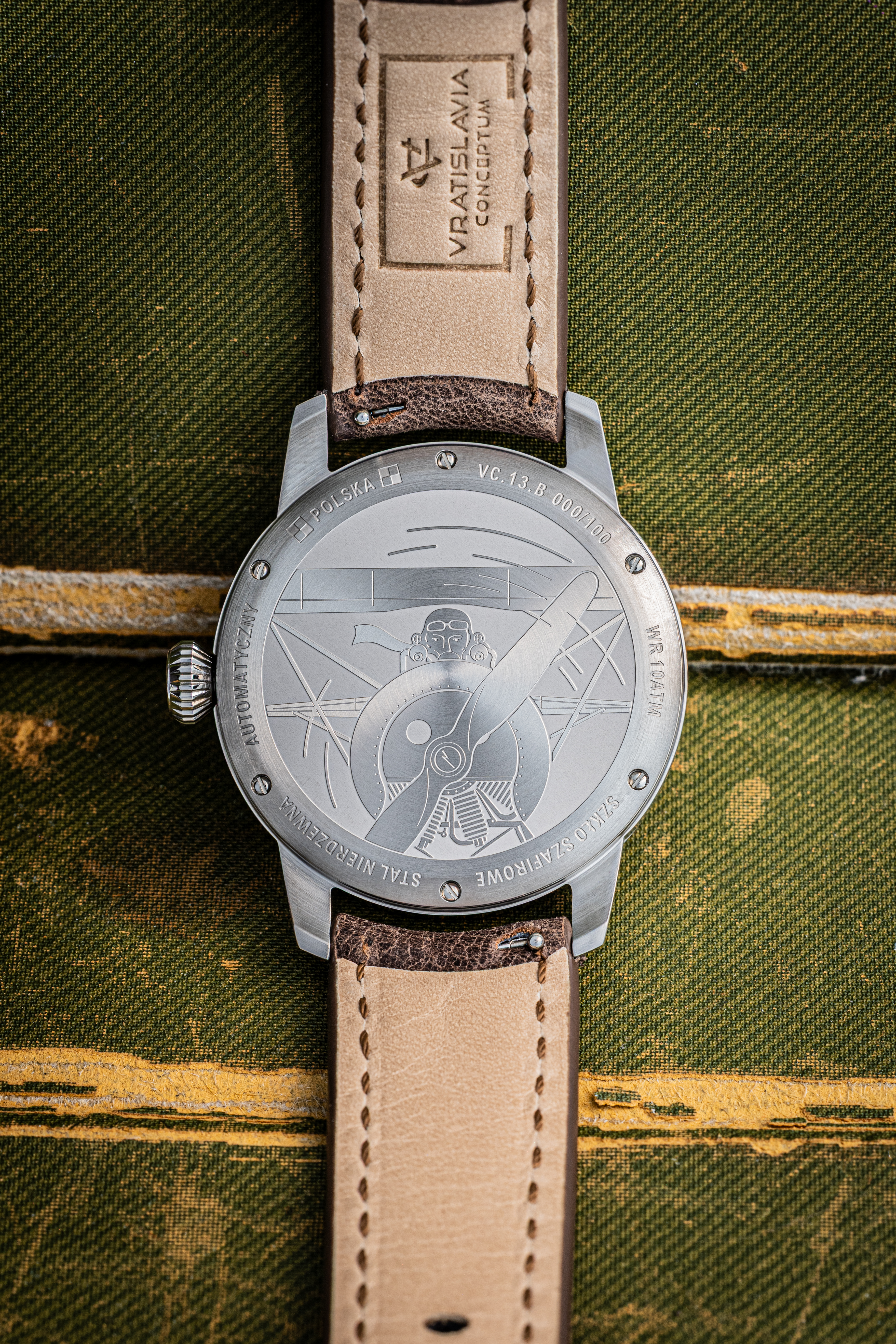 Dekielek zegarka zawiera informacje o numerze obudowy (numer limitacji) oraz głęboko grawerowana grafikę przygotowaną przez współpracującego z nami arch. Piotra Trojniela z wizerunkiem zdobycznego samolotu myśliwskiego Fokker D.VIII.