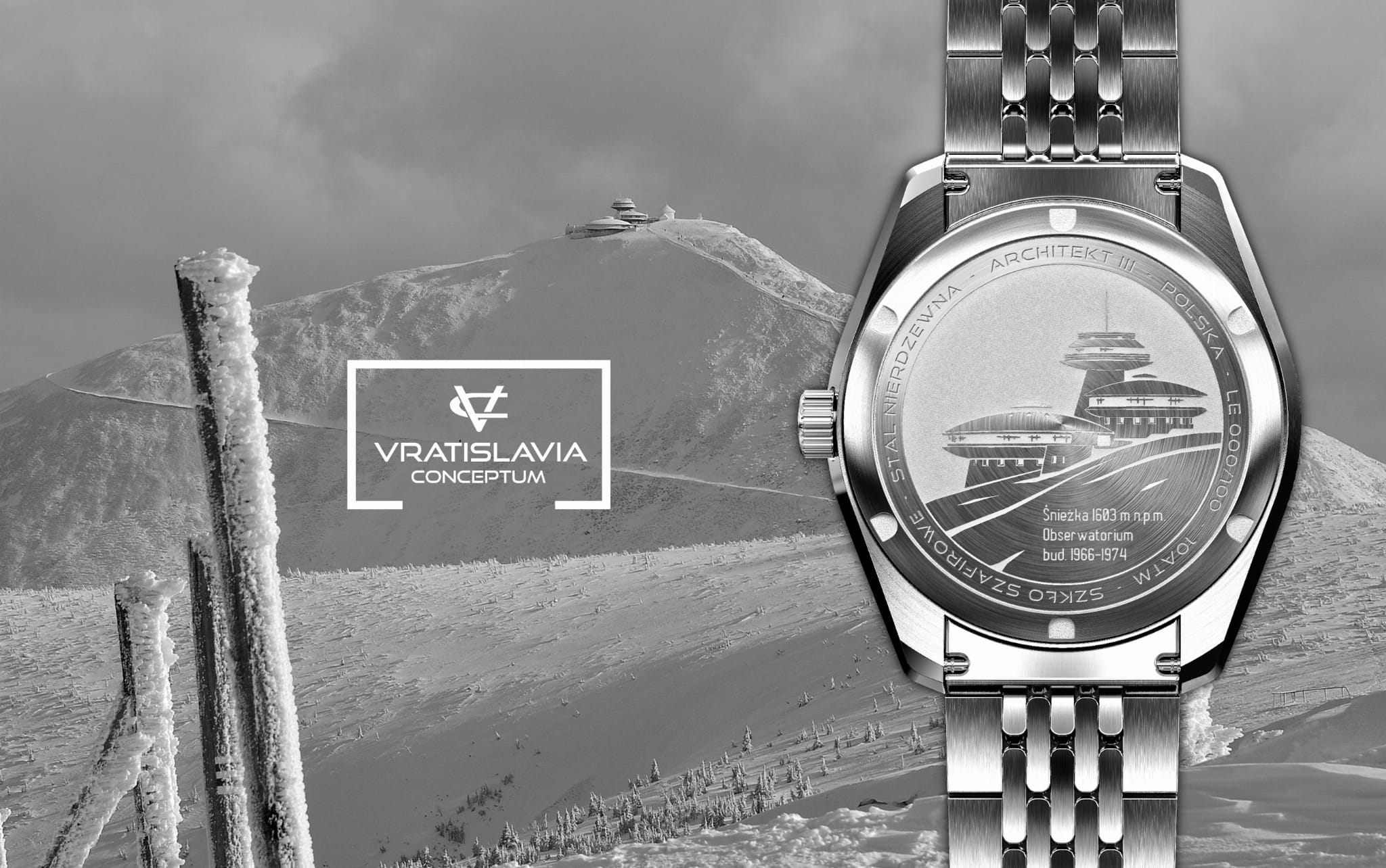 Architekt III to projekt dedykowany wszystkim miłośnikom spójnych, harmonijnych, modernistycznych dzieł architektury. Techniczny, symetryczny, surowy w swojej konsekwencji i wykończeniu projekt tarczy powoduje, że odkrywamy na nowo czytelność wskazań 3-wskazówkowego zegarka. Dekielek został głęboko wygrawerowany wizerunkiem ikonicznego dzieła wrocławskich architektów Waldemara Wawrzyniaka i Witolda Lipińskiego czyli Obserwatorium na Śnieżce. Pierwotny projekt futurystycznego obiektu zakładał pokrycie go połaciami blachy nierdzewnej która miała mienić się w słońcu i przywodzić na myśl lądujące spodki UFO.