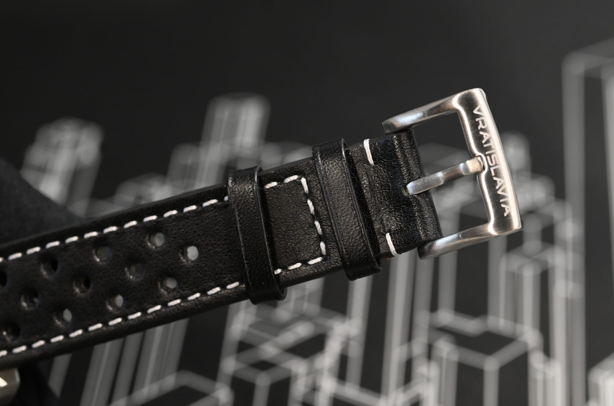 - Czarny pasek skórzany wentylowany typu “Rally” z białym przeszyciem i sygnowaną szczotkowaną klamerką.