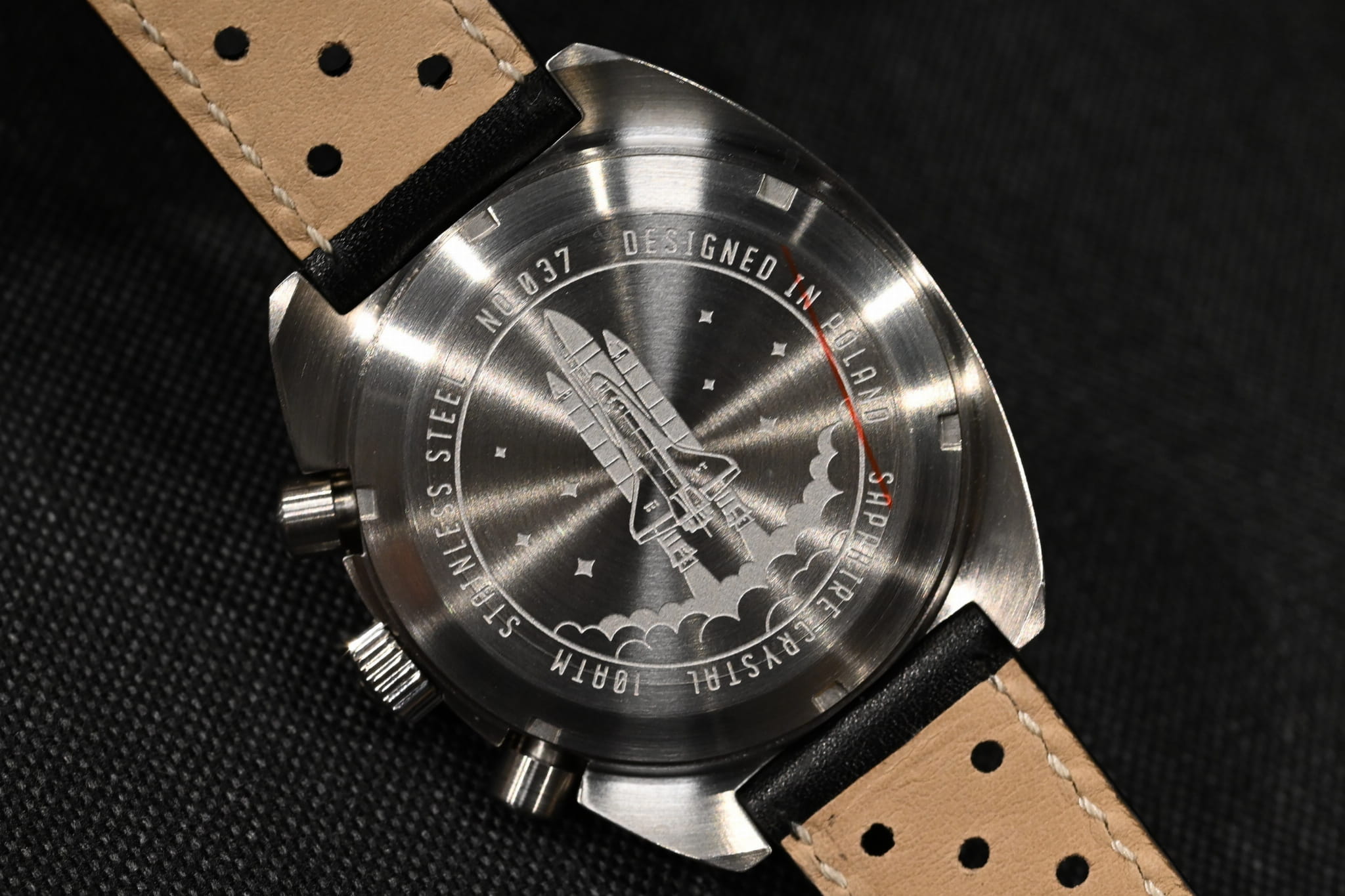 Model inspirowany pierwszym zegarkiem na Księżycu. Opatrzony jednak autorskimi wyróżniającymi go spośród podobnych projektów cechami takimi jak koperta z serii Heritage Chrono, głęboki grawer na dekielku przedstawiający startujący prom kosmiczny ( autor grafiki: arch. Piotr Trojniel )