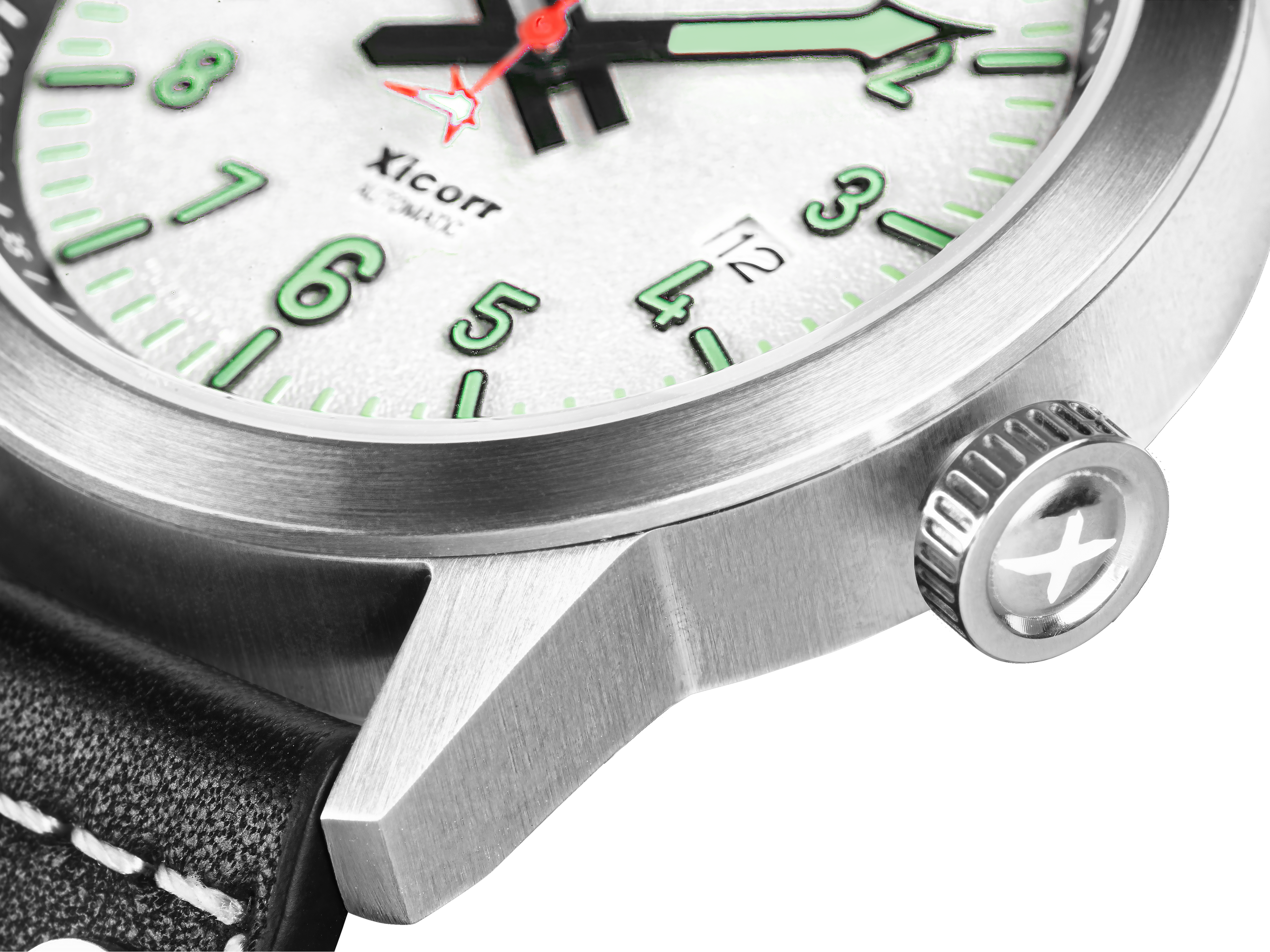 Koperta 44 mm. Duża, wygodna koronka z elementami odpowiadającymi indeksom z tarczy. Logo Xicorr wykonane z masy święcącej - lumy.