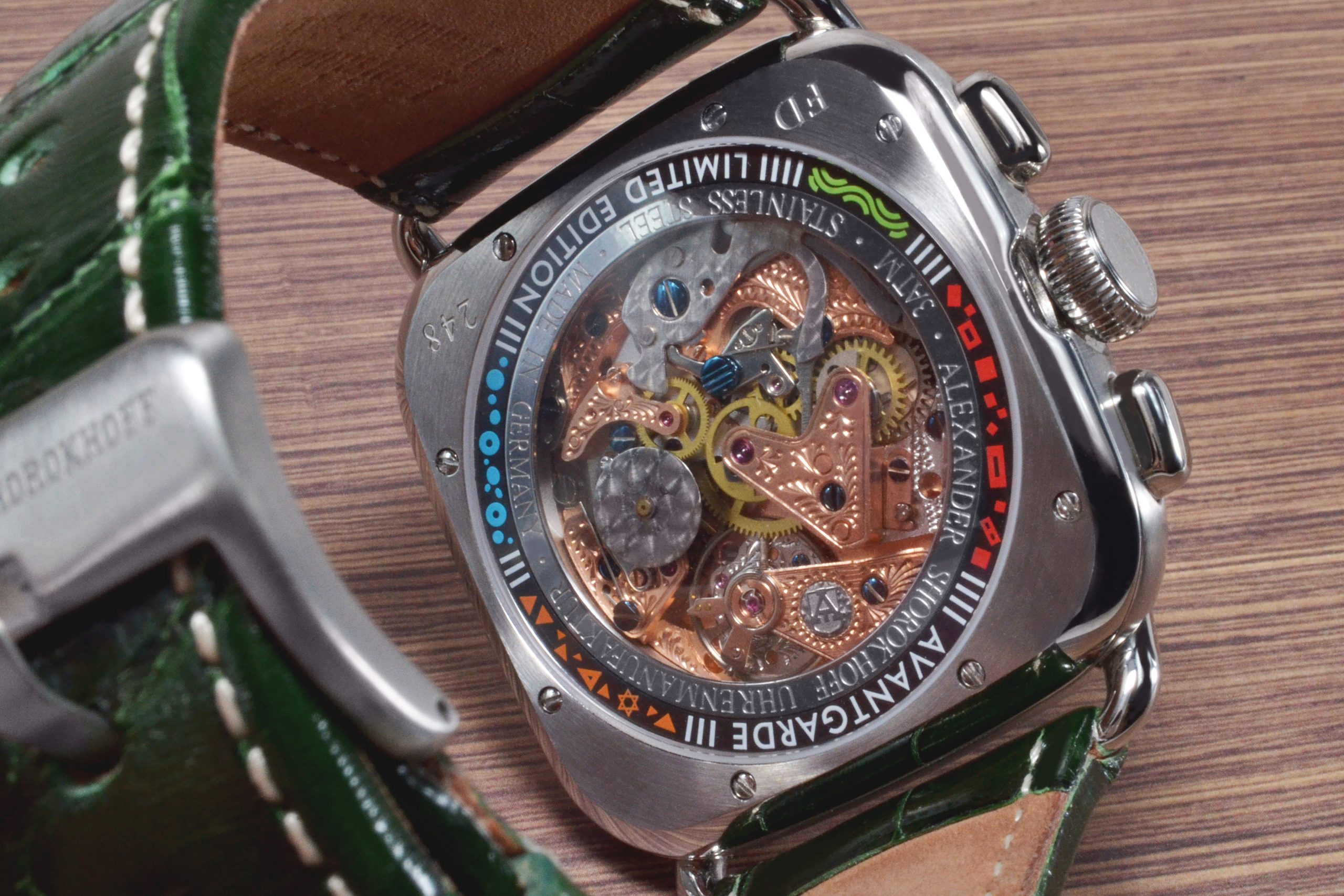 Każdy zegarek w tej limitowanej serii (jedynie 30 sztuk) skrywa w sobie precyzyjny mechanizm ręcznego naciągu AS 3133. Starannie zdobiony, ręcznie grawerowany i dopracowany w manufakturze Alexander Shorokhoff, stanowi kwintesencję najwyższej klasy zegarmistrzowskiej. Jego kunszt można podziwiać przez szafirowy dekiel, a awangardowy pierścień na odwrocie dodatkowo podkreśla unikalny charakter kolekcji.